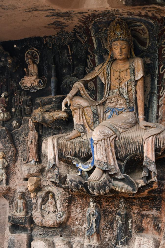 在毗盧洞景區,有一座聞名遐邇的“蹺腳觀音”造像:不同于常見的觀音造像,這座觀音左腳懸于臺外、右腳蹺起,隨意而坐,神態倜儻,顯得瀟灑自如,悠然自得?!败E腳而立,改變了北方石窟傳統造像正襟危坐、端莊典雅的形象,令人感到非常親民?!睏钚銈フf。