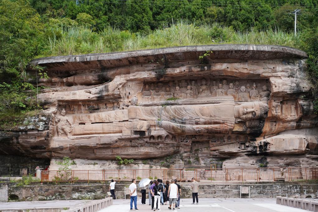 伴著絲絲桂香,沿著濱河步道一路前行,不出片刻便抵達四川省資陽市安岳縣臥佛院景區。山野深處,一尊身長23米的左側臥佛逐漸映入眾人眼簾。