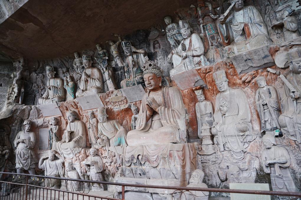 此外,記者注意到,毗盧洞景區的造像頂部搭建了鋼架棚,柳本尊“十煉”修行圖石窟上面外側還加修窟檐,水滴可直接落到地上而避免了順著巖壁下流。景區內,工人們也正在加緊進行二期保護項目的施工。