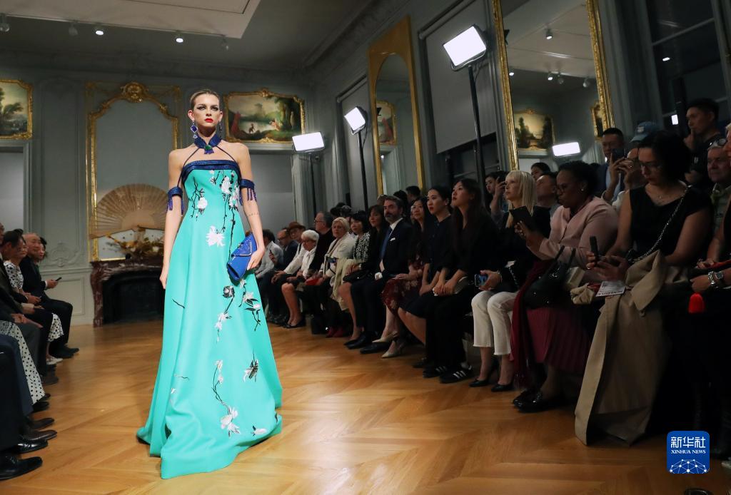 9月27日,模特在法國巴黎中國文化中心舉辦的“恭王府服飾秀”上展示設計師勞倫斯·許創作的恭王府系列高定服裝。新華社記者 高靜 攝