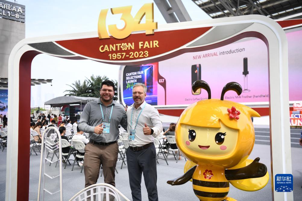 10月15日,來自巴西的采購商在廣交會上合影。新華社記者 鄧華 攝