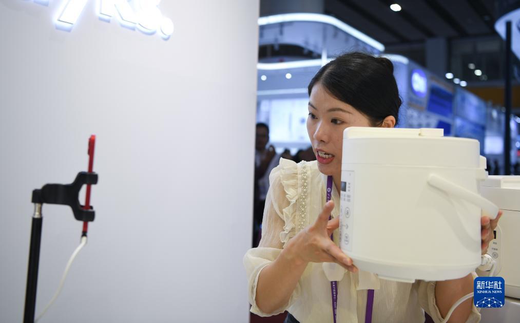 10月15日,參展的工作人員在展臺直播介紹家電產品。新華社記者 鄧華 攝
