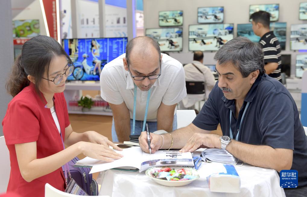 10月15日,客商在廣交會上洽談業務。新華社記者 盧漢欣 攝