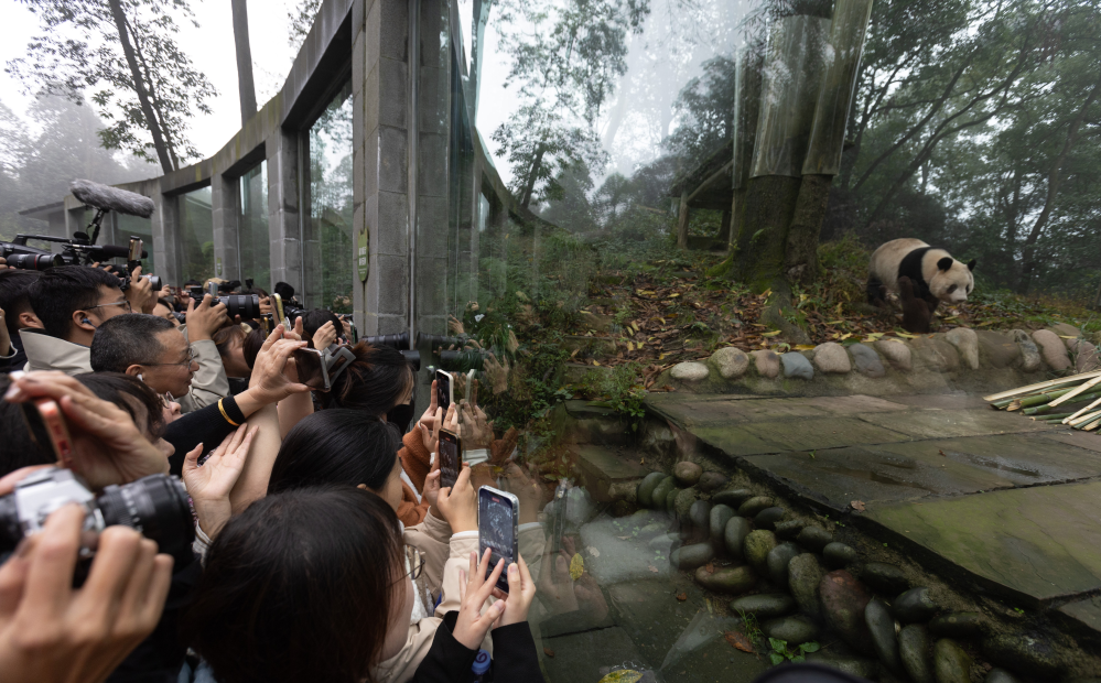 大熊貓“香香”日本親友團成員在中國大熊貓保護研究中心雅安基地看望“香香”(11月8日攝)。新華社記者 江宏景 攝