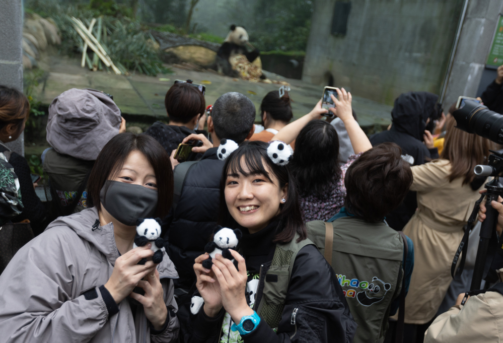 四川雅安碧峰峽,日本大熊貓攝影師高氏貴博在人群中踮起腳尖,和一同來探望“香香”的日本粉絲們等待著。當嬌憨的“香香”現身林間時,他高舉相機、按下快門,成就他拍攝大熊貓的3371天。