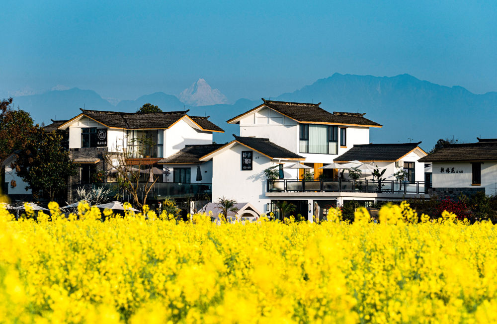 距離成都市區僅一小時路程的成都崇州市白頭鎮五星村,最出圈的特產是油菜花。每到春天,競相開放的千畝油菜花海,再配上灰瓦白墻的新川西民居和遠處的山巒起伏,構成一幅絕美的山水畫卷,有成都周邊“小婺源”之稱。