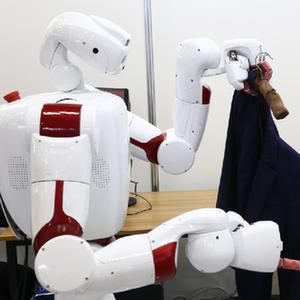 在日本早稻田大學的展位上,一個正在往衣架上掛衣服的機器人吸引了眾多參觀者駐足。研究人員告訴記者,掛衣服對人來說是小事一樁,但對機器人來說很難,因為當機器人抓住衣服的一部分時,無法知道下一個瞬間衣服會變成怎樣的形狀。借助深度預測學習技術,他們解決了這個難題。