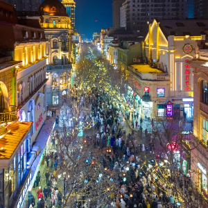 1月9日,游客在哈爾濱百年老街中央大街上游玩(無人機照片)。 新華社記者 張濤 攝