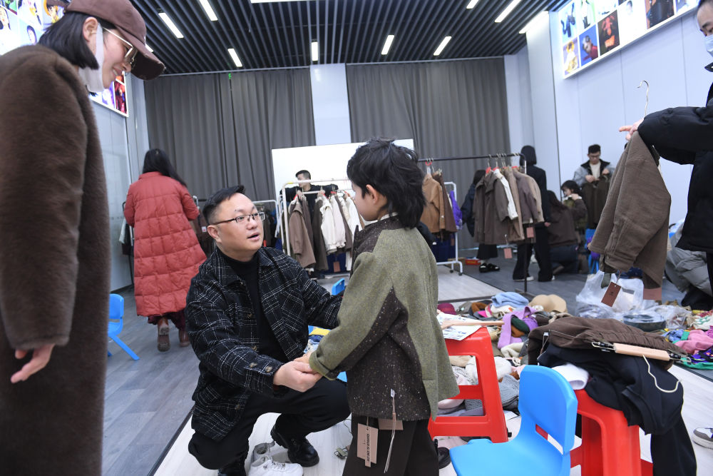 2024年1月17日,在位于浙江省湖州市織里鎮的萬順服飾股份有限公司,工作人員(前左二)在品牌的2024秋季新品審版會后臺和小模特交流??椑镦偸侵袊畲蟮耐b產業集群地,聚集著1.4萬家童裝企業。新華社記者 翁忻旸 攝