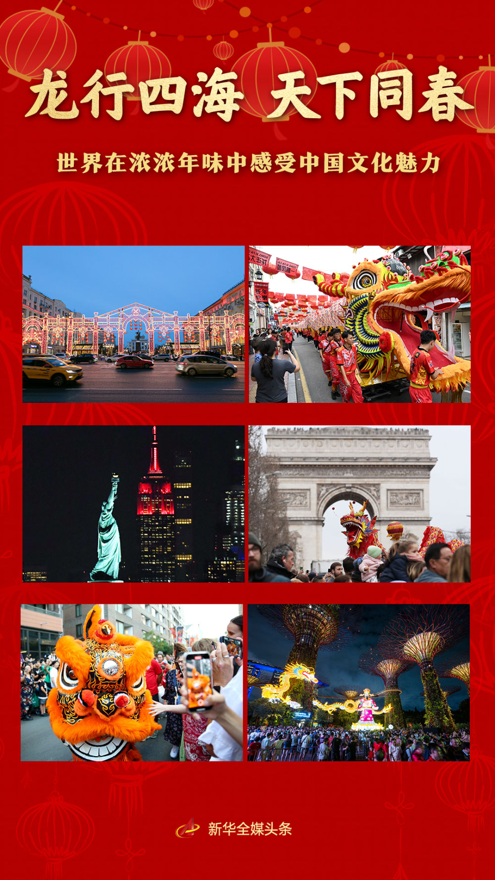 從各國使節在聯合國體驗包餃子、寫福字,到瑞士日內瓦萬國宮高懸起大紅燈籠,從新加坡“春到河畔”的巨龍燈飾熠熠生輝,到馬來西亞馬六甲的百余少年共舞長龍……天下同春,龍年的祝福正從四面八方傳來。