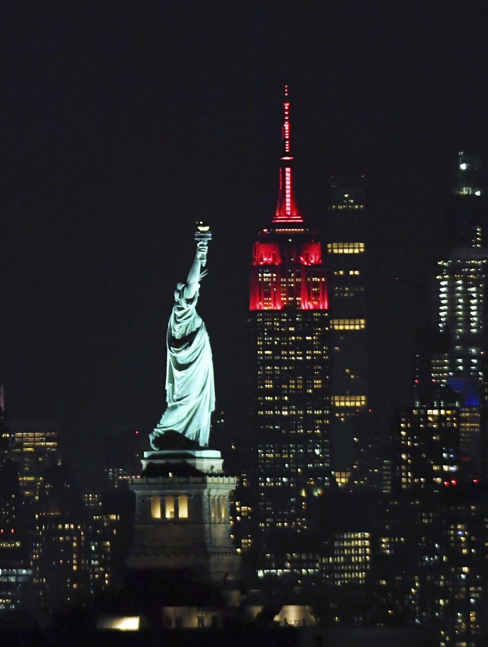 2月8日晚,美國紐約帝國大廈亮起中國春節主題燈光。新華社記者 李睿 攝