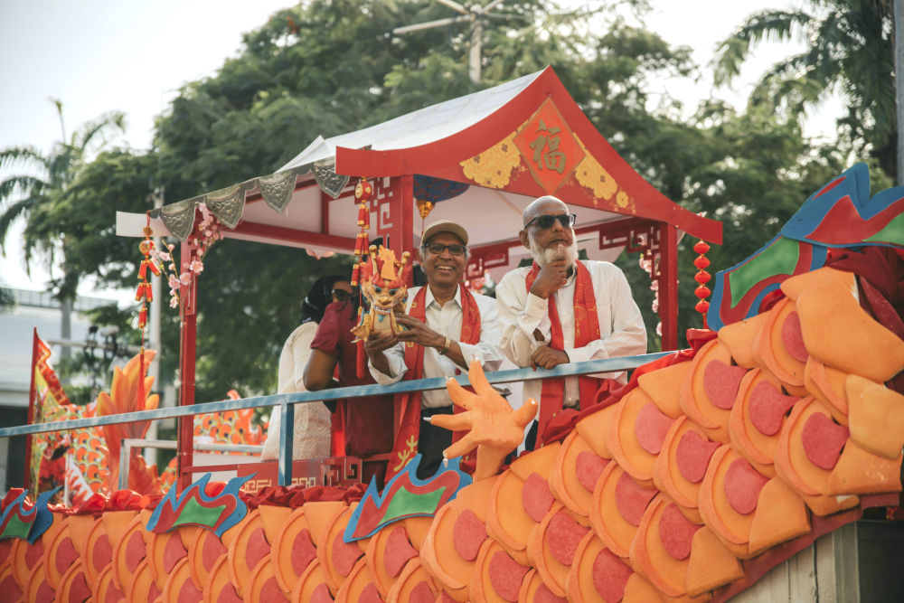 2月3日,在毛里求斯首都路易港,毛里求斯副總理胡斯努(左)參加花車巡游活動。新華社發(中國駐毛里求斯大使館供圖)