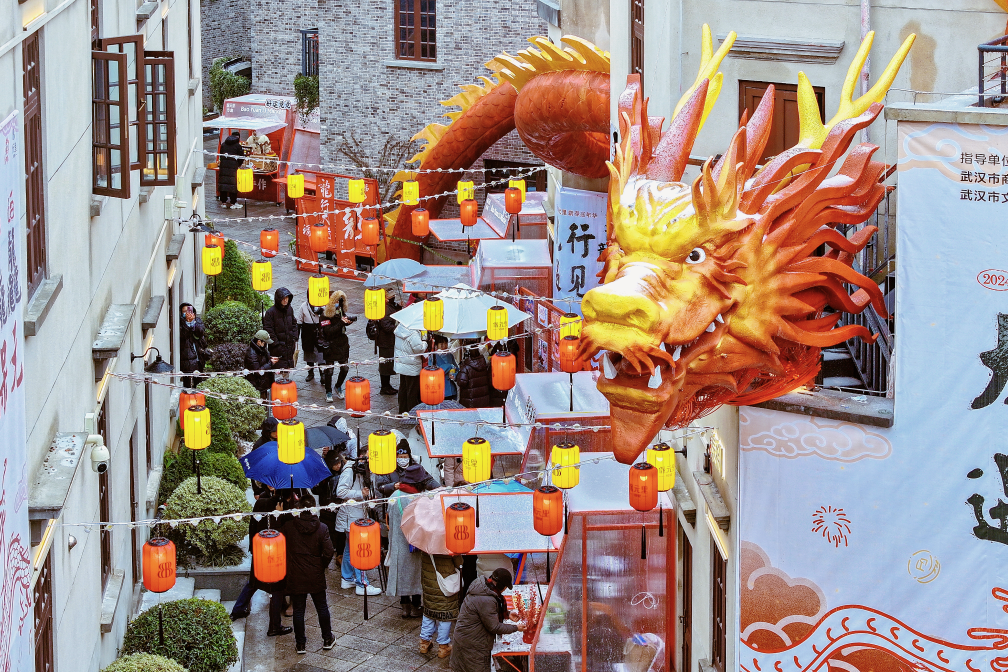 2月10日大年初一,走進漢口歷史風貌區保元里,一條長約20米的中國紅巨龍喜迎八方來客。在武漢曇華林,20余家市集攤位售賣新春年貨、藝術文創等商品。充滿創意的潮流市集激活了春節消費。