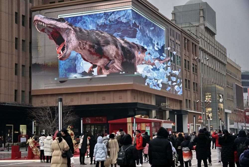 市民在北京王府井商業街觀看裸眼3D大屏幕的動畫(2024年2月2日攝)。新華社記者 李欣 攝