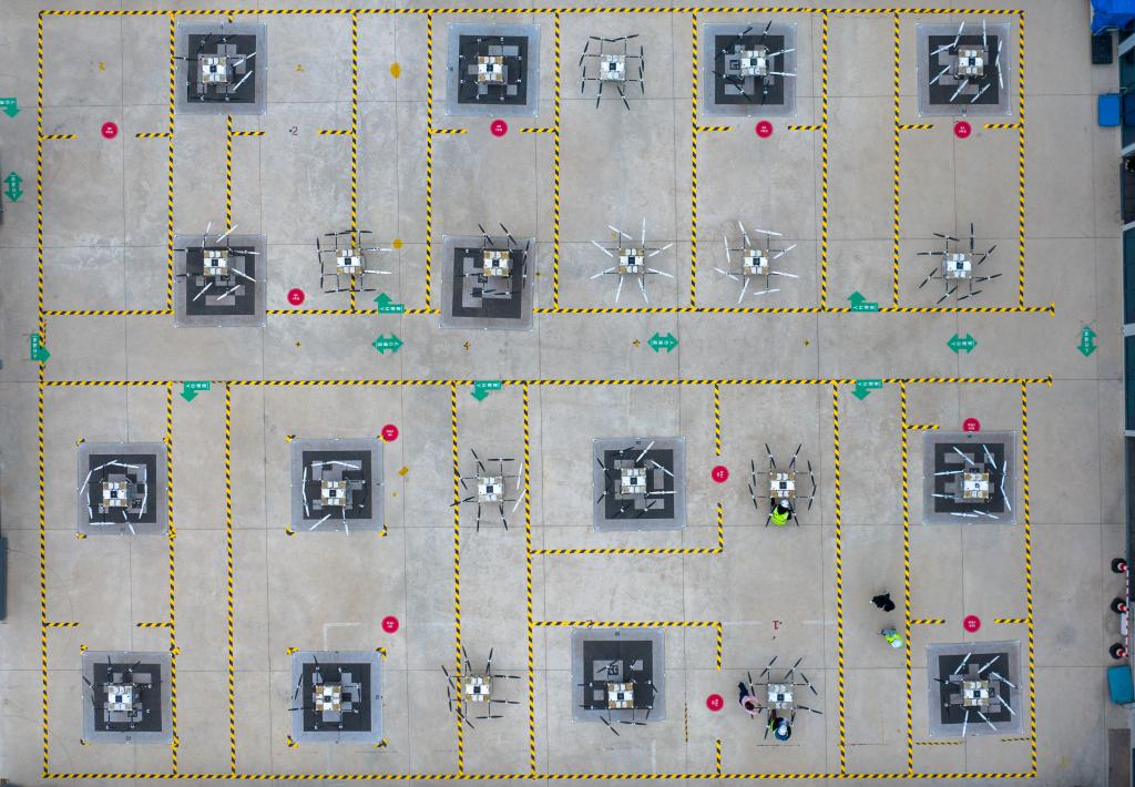 在豐翼無人機運營中心,地勤人員對無人機進行起飛前的檢查(無人機照片)。