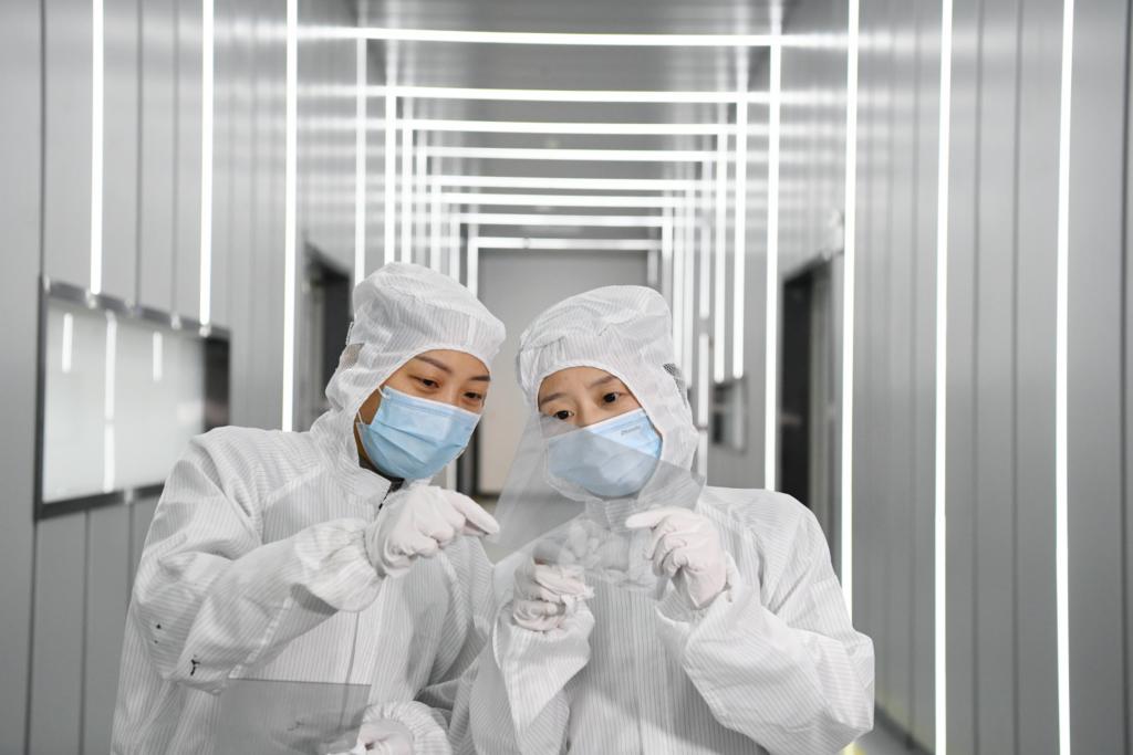 在東超科技工廠,技術人員檢查負折射平板透鏡原材料的品質。