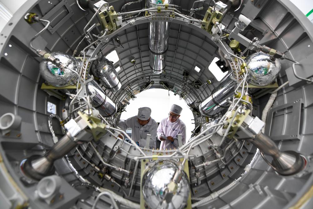 北京星際榮耀空間科技股份有限公司裝配測試人員在安裝液體姿軌控動力系統。