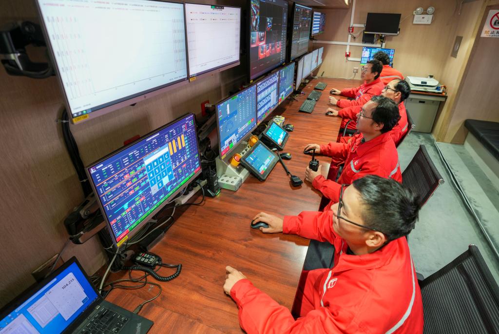 技術人員在重慶涪陵頁巖氣田焦頁5號電驅壓裂平臺控制室作業。