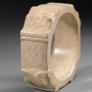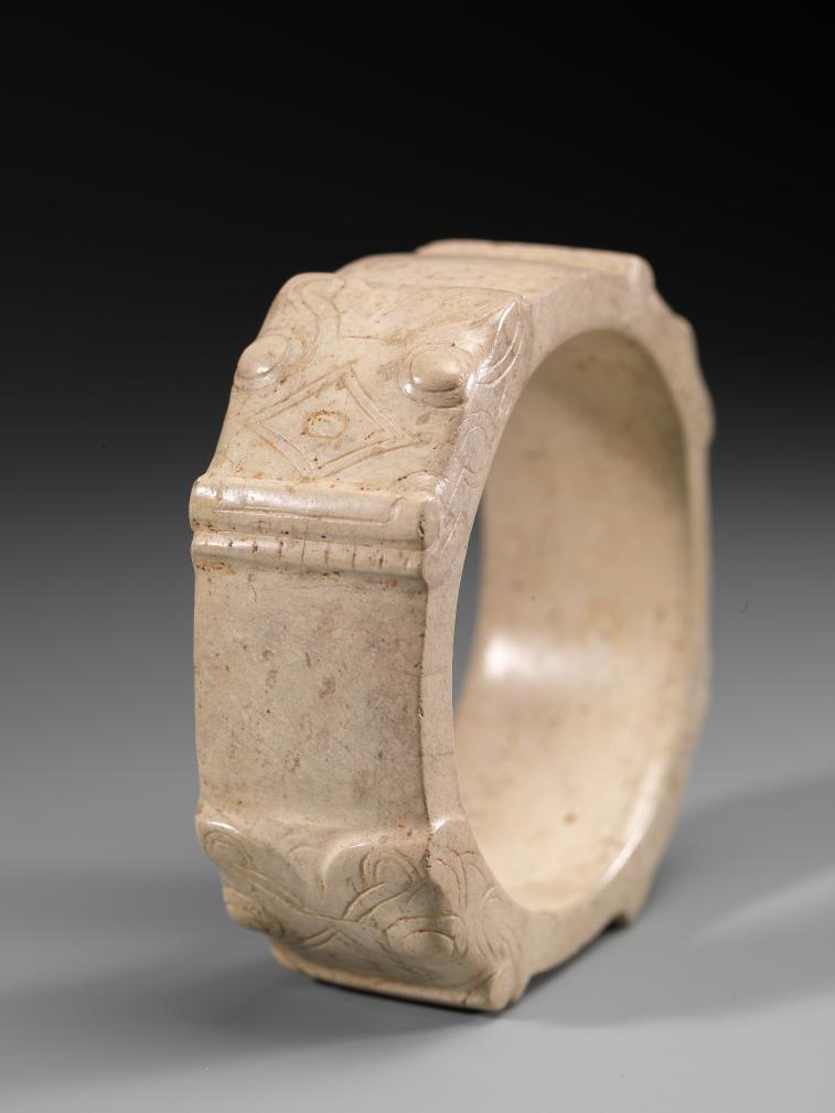 這枚玉鐲高2.65厘米,直徑8.2厘米,孔徑6.1厘米。它整體作寬扁的環狀,內壁平直光滑,外壁琢刻出4個凸面,其上刻有龍首紋。龍首紋下部是龍首的扁寬嘴,露出平直的上唇和大而方整的上排牙齒,上唇兩側有圓形凸起的鼻孔。再往上就是一對大而圓凸的眼球,外飾圓形眼圈,兩眼上方還有一對短角。