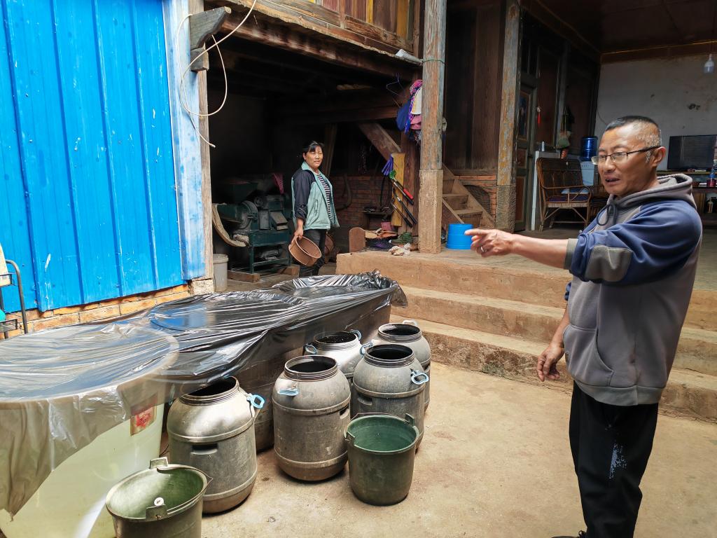 3月14日,元江縣洼垤鄉老茶己村村民龍玉春(右)在家里介紹儲水情況。新華社記者林碧鋒 攝