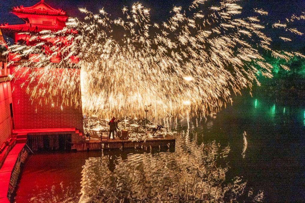 傳承古老技藝的同時,劉小松還對打鐵花的表演內容和形式進行創新,融入舞火龍等民俗元素和聲光電等科技元素?!霸谠仙?,我們研制開發了開花大、亮度高、具有阻燃性能的新型打鐵花原料,落地即滅,環保性強,安全度也高?!眲⑿∷烧f。