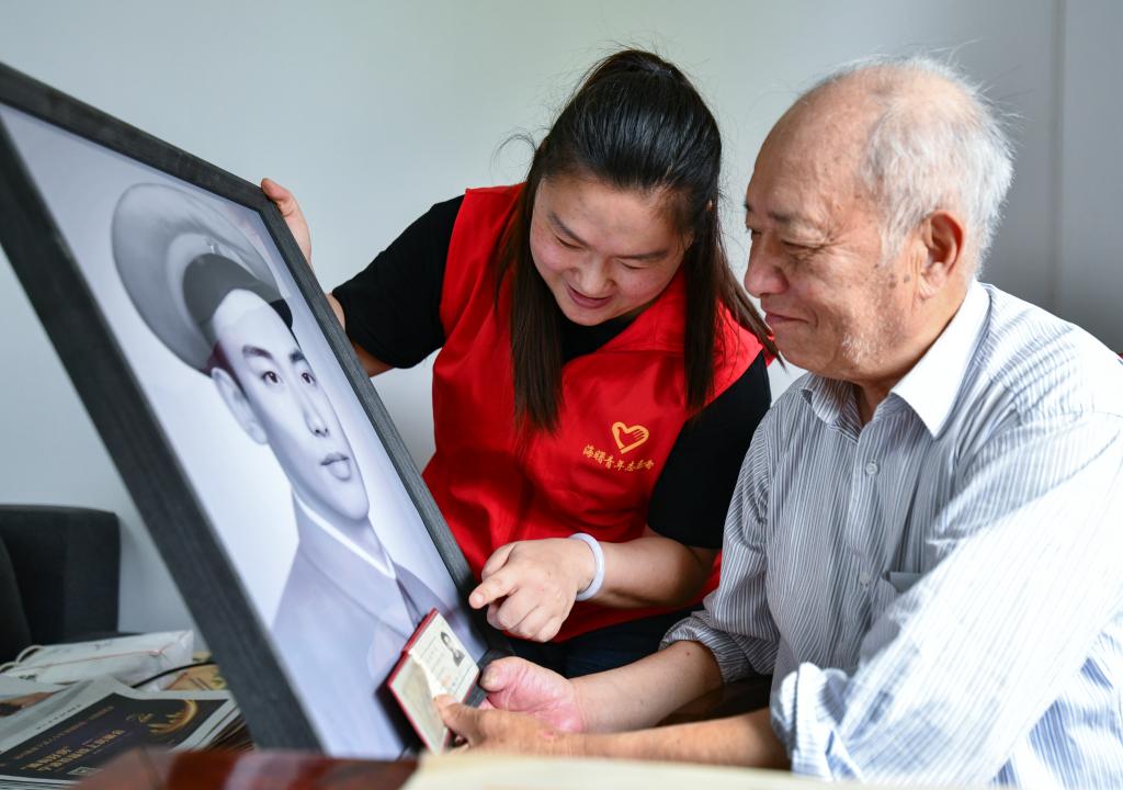 孫嘉懌給烈士后代送去志愿者修復的烈士遺像。(丁繼敏 攝)