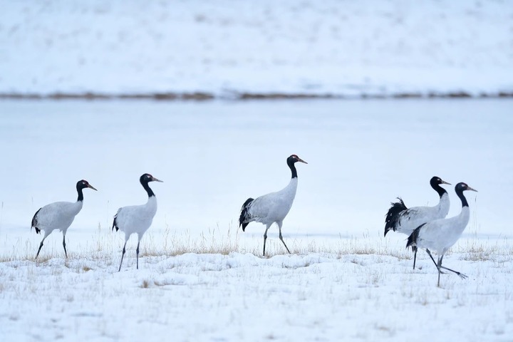 2021年10月21日,在青海省的三江源國家公園黃河源園區內拍攝的黑頸鶴。新華社記者 張龍 攝