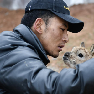 2020年7月7日,在可可西里卓乃湖保護站,保護隊員才文多杰照顧一只藏羚羊幼仔。新華社記者 張龍 攝