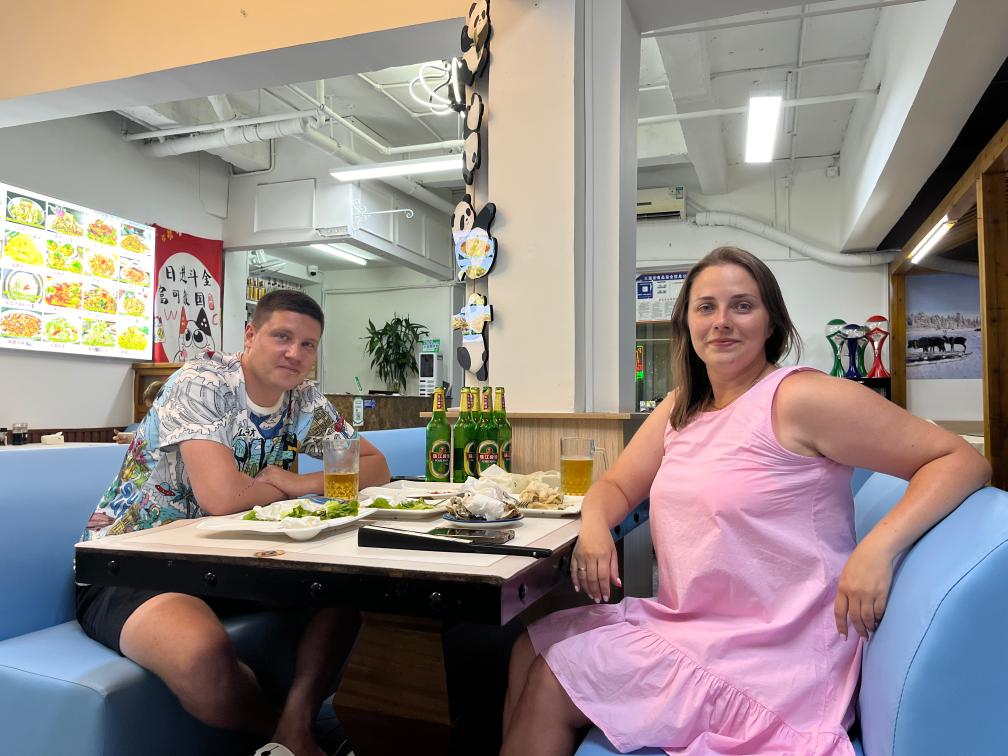 7月13日,俄羅斯游客奧爾加(右)和丈夫在中國餐廳用餐。新華社記者 陳子薇 攝