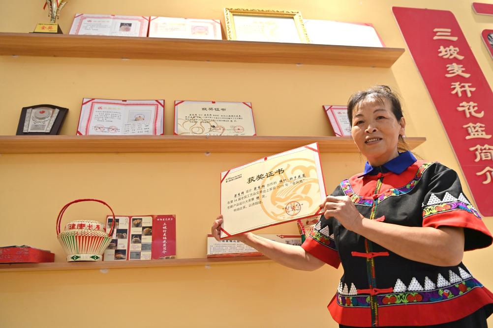 梁秀群在百色市田陽區巴別鄉三坡村民俗文化傳承館展示自己獲得的獎項(8月21日攝)。