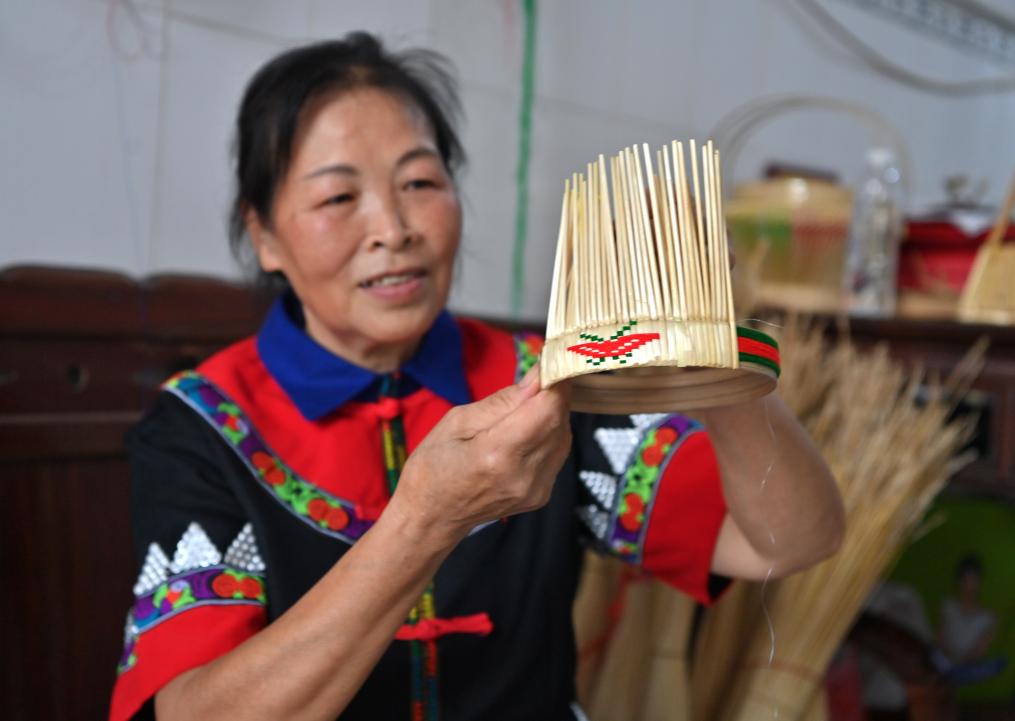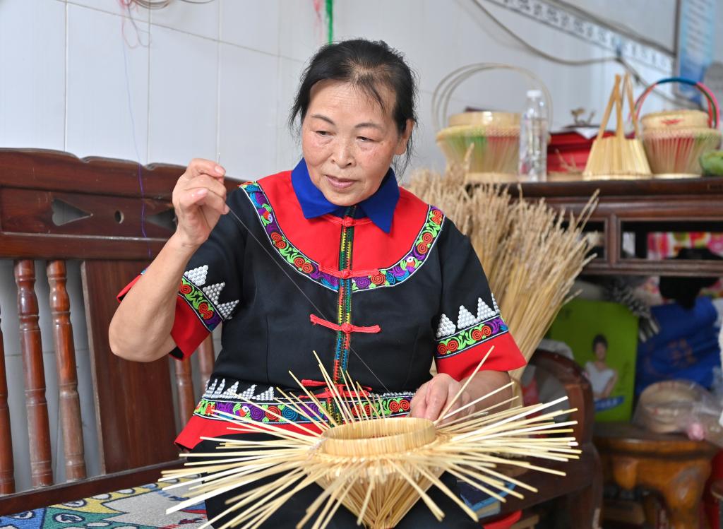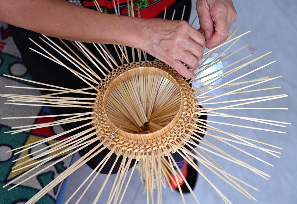 72歲的廣西百色市田陽區巴別鄉三坡村村民梁秀群是廣西壯族自治區級麥稈花籃編織技藝非物質文化遺產傳承人