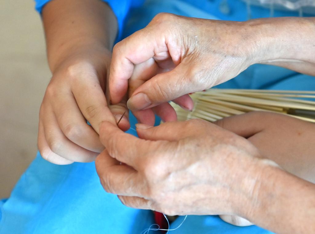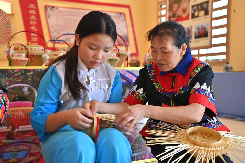 梁秀群(右)在百色市田陽區巴別鄉三坡村民俗文化傳承館教14歲的陸新睿編織麥稈花籃(8月21日攝)。