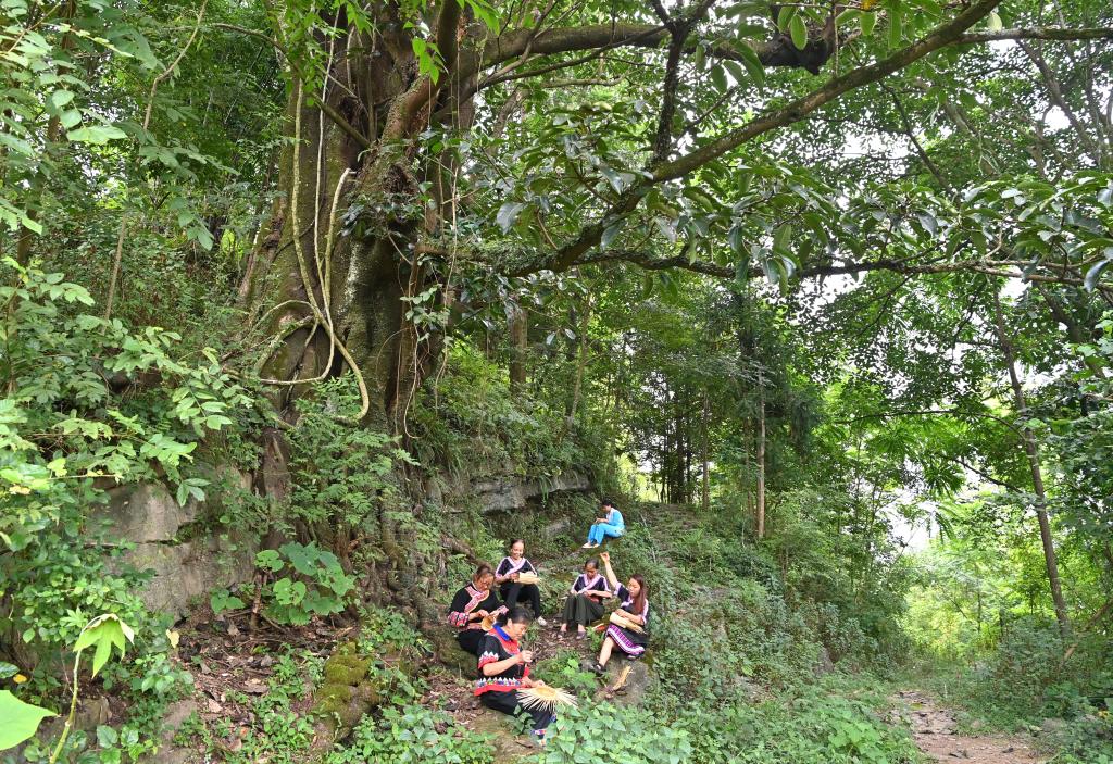 梁秀群在百色市田陽區巴別鄉三坡村大榕樹下帶著她的編織小隊編織麥稈花籃(8月21日攝)。