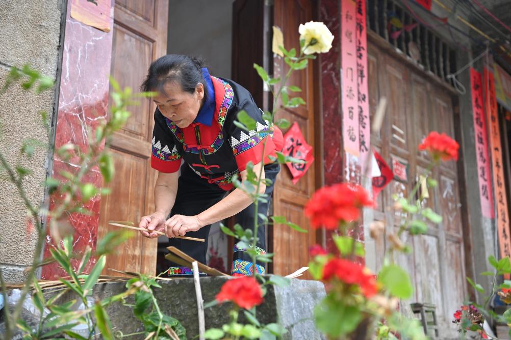 梁秀群在百色市田陽區巴別鄉三坡村自家門前晾曬竹篾(8月21日攝)。