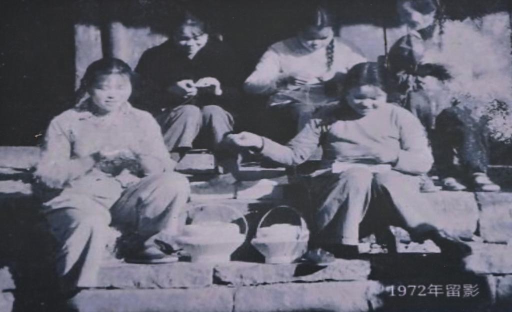 這是梁秀群(左一)1972年在百色市田陽區巴別鄉三坡村和鄰居編織麥稈花籃(8月21日翻拍)。