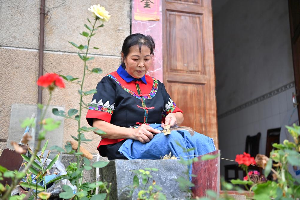 梁秀群在百色市田陽區巴別鄉三坡村自家門前削竹篾(8月21日攝)。