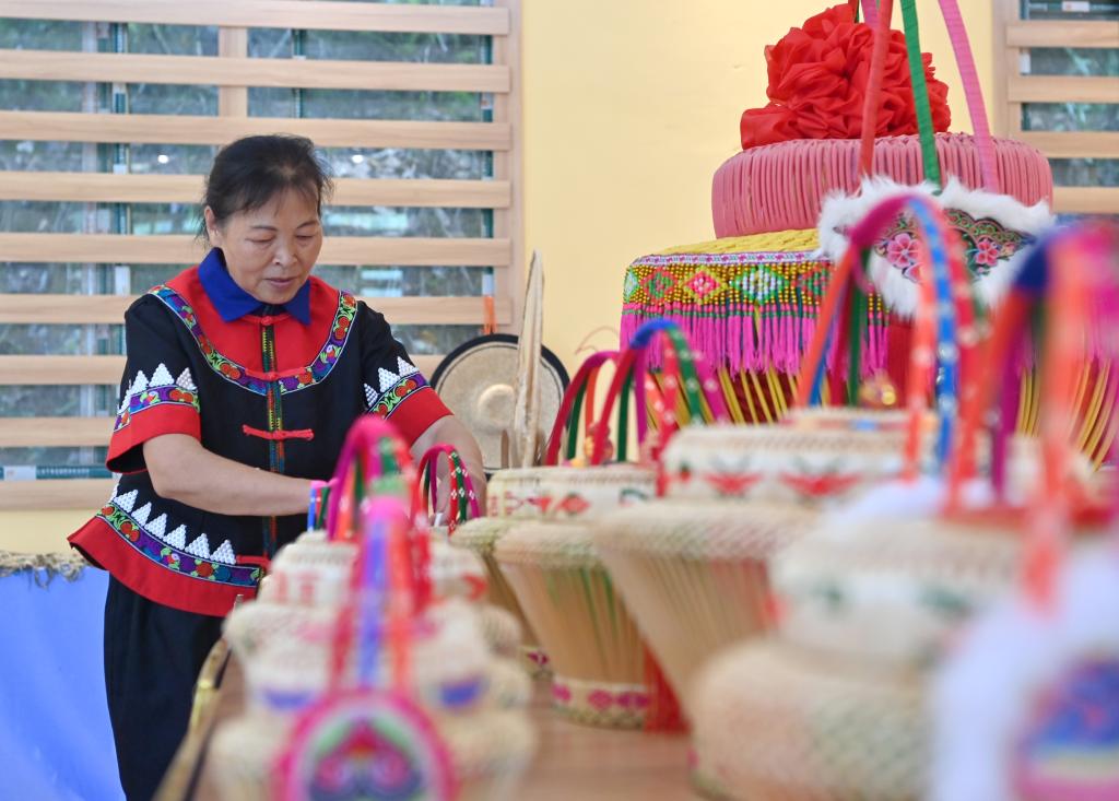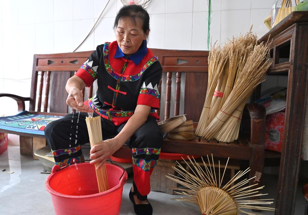 梁秀群在百色市田陽區巴別鄉三坡村民俗文化傳承館整理麥稈花籃(8月21日攝)。