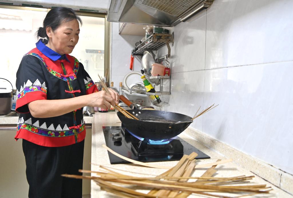 梁秀群在百色市田陽區巴別鄉三坡村自家灶臺煮竹篾(8月21日攝)。