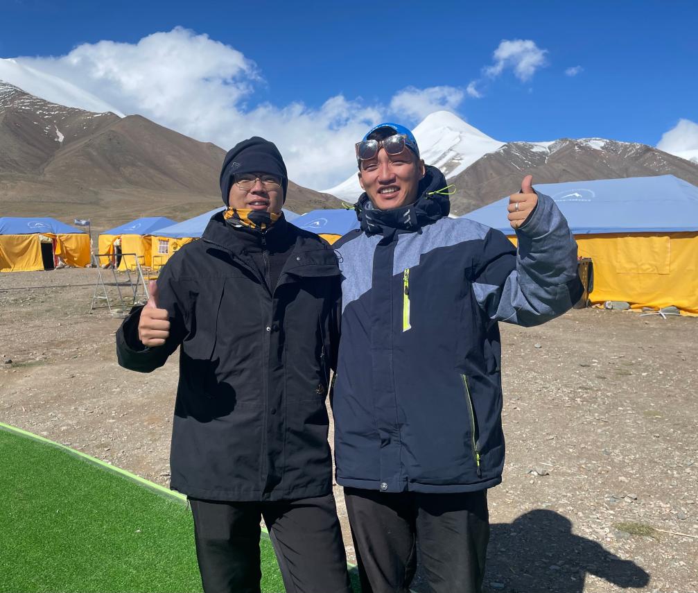 ↑熊警(左)和方源達在玉珠峰登山大本營。新華社記者 李琳海 攝