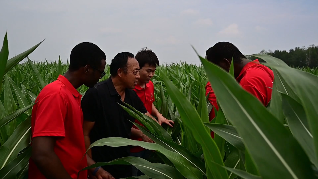 河北省曲周縣槐橋鎮西漳頭村,種植大戶任京河正在和非洲留學生們交流玉米施肥注意事項。