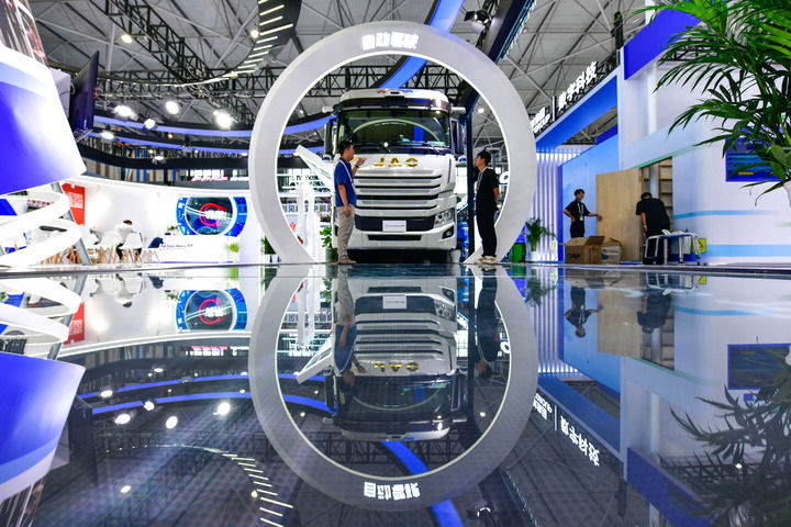 2024年8月28日,工作人員在數博會上介紹滿幫集團展出的無人駕駛重型卡車。新華社記者 楊文斌 攝