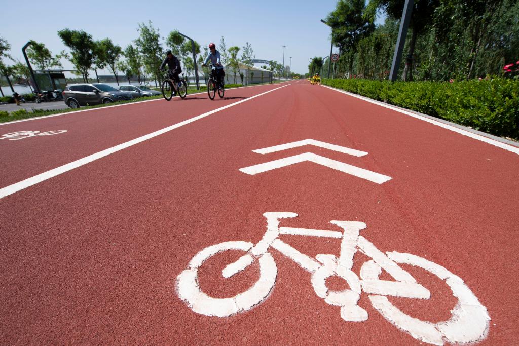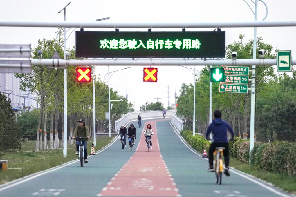 2023年4月27日,在北京自行車專用路上騎行通勤的市民。這是國內首條通勤用自行車專用路。新華社記者 鞠煥宗 攝