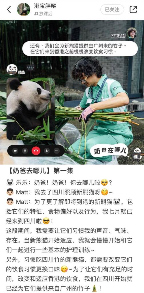 為了解新赴港大熊貓的特征、食物偏好以及行為,香港海洋公園的大熊貓護理員梁家綸7月已抵達四川,讓大熊貓們習慣他的聲音、氣味、存在,大熊貓適應后,他開始和它們一起進行基本護理訓練。