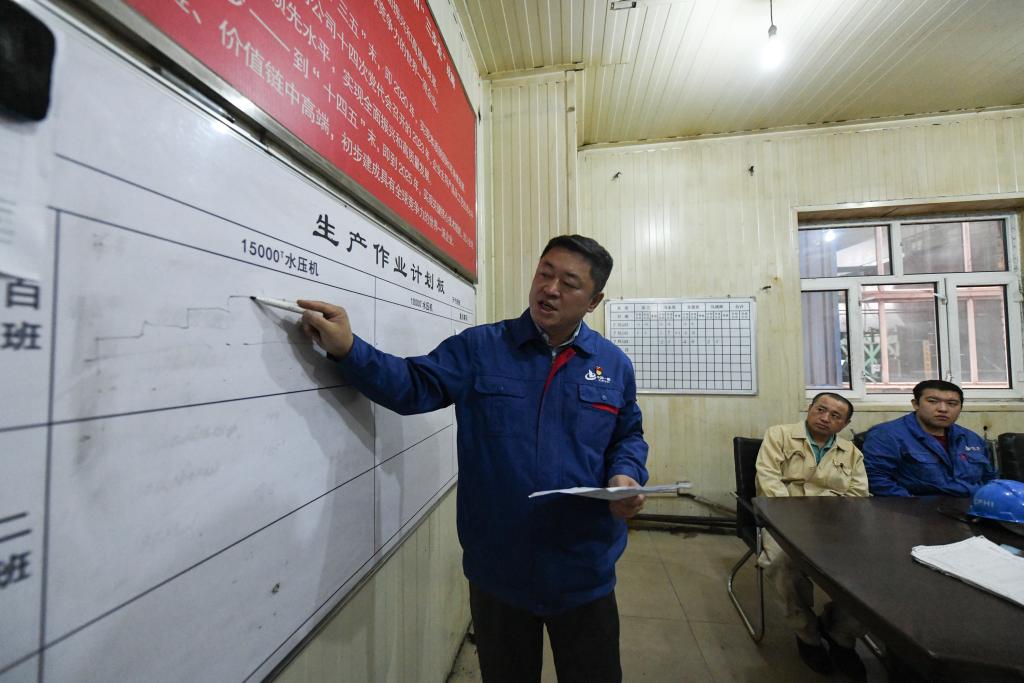 劉伯鳴在中國一重集團有限公司的廠房會議室內布置當日生產任務、操作重點及注意事項。新華社記者 王松 攝
