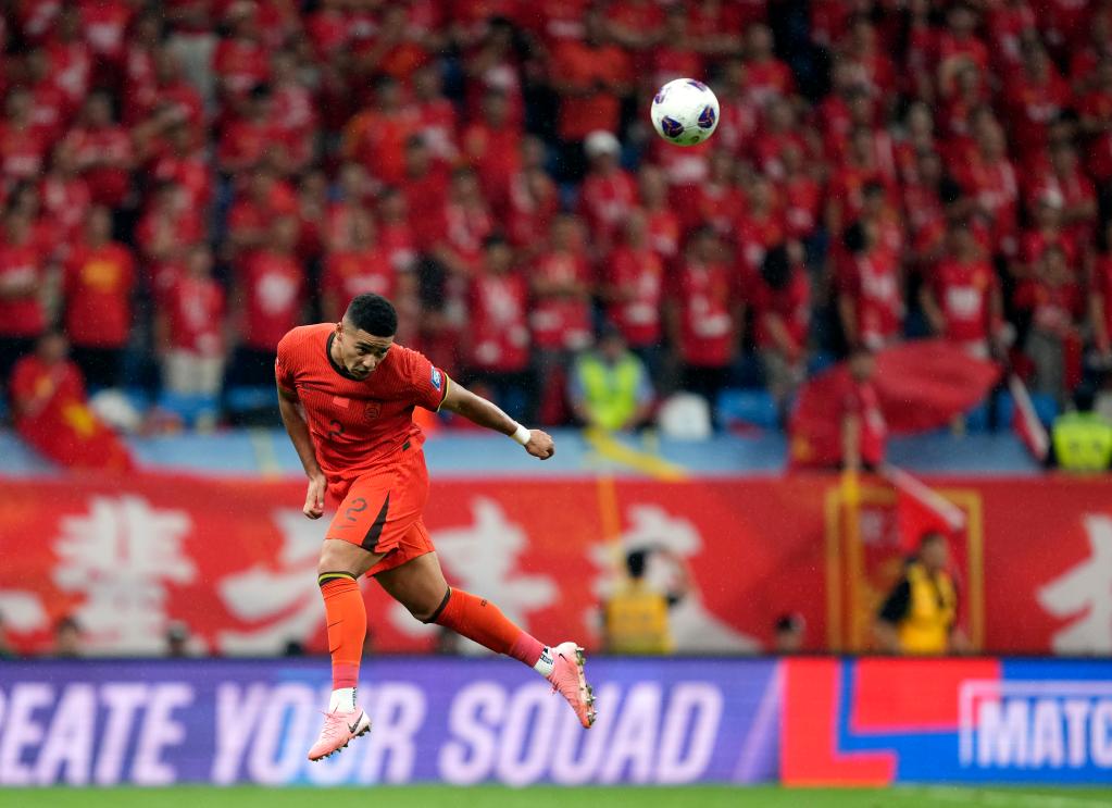 2024年9月10日,中國隊球員蔣圣龍(上)在對沙特比賽中頭球攻門,導致對方打入一粒烏龍球。新華社記者 賈浩成 攝