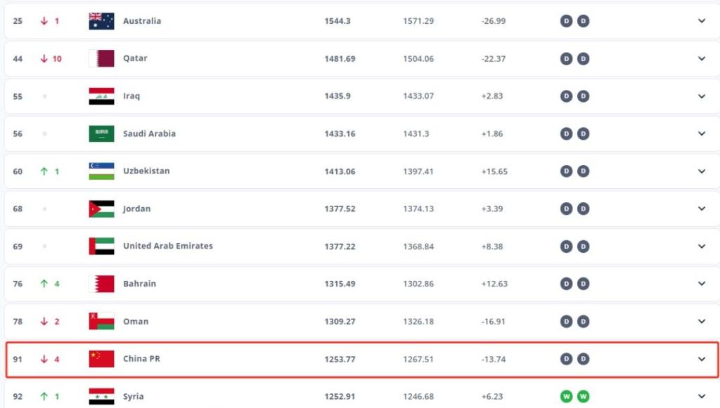 國際足聯公布最新一期男足世界排名,截圖為亞洲球隊排名情況。