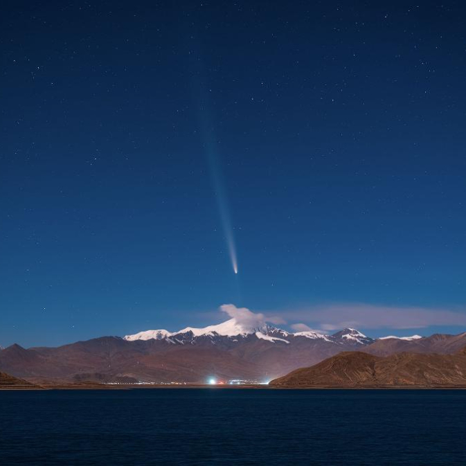 2024年10月15日在西藏山南羊卓雍措拍攝的紫金山-阿特拉斯彗星與雪山“同框”。(戴建峰攝)
