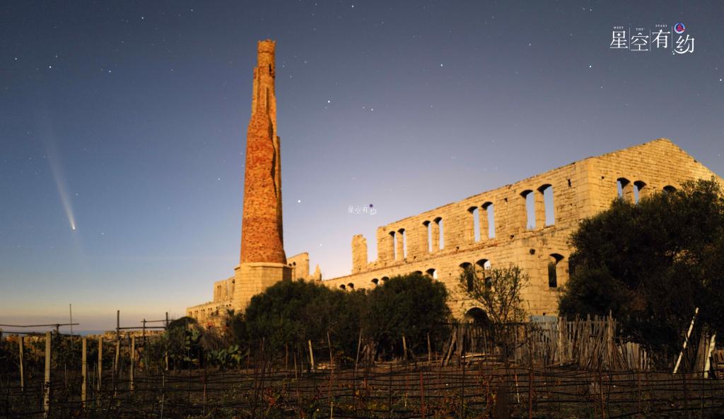2024年10月14日,在意大利西西里大區拉古薩省,紫金山-阿特拉斯彗星從一處歷史遺址的上空劃過。新華社發(埃德加多·切魯托攝)