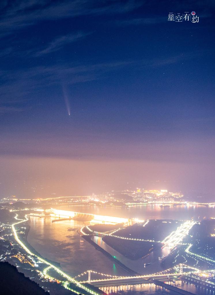 2024年10月14日在湖北宜昌夷陵區拍攝的紫金山-阿特拉斯彗星與三峽大壩“同框”。(雷勇攝)