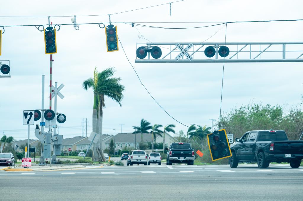 10月10日,在美國佛羅里達州坦帕,颶風“米爾頓”過境后,被損壞的交通信號燈懸在半空。新華社發(瑞安·布羅克攝)